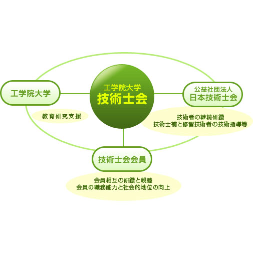 工学院大学技術士会は、会員相互の研鑽と親睦を図り、もって会員の職務能力と社会的地位の向上を図る。併せて、公益社団法人日本技術士会と連携し、技術者の継続研鑽及び技術士補と修習技術者の技術指導に関する諸活動を行うとともに工学院大学と社会の発展に寄与することを目的として2007年3月17日に設立されました。