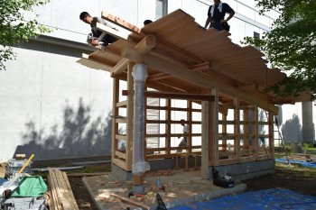 今後、竹小舞かきや8月上旬に練り返した土を利用した荒壁塗りを学生たちが行い、竣工は10月末を予定しています。