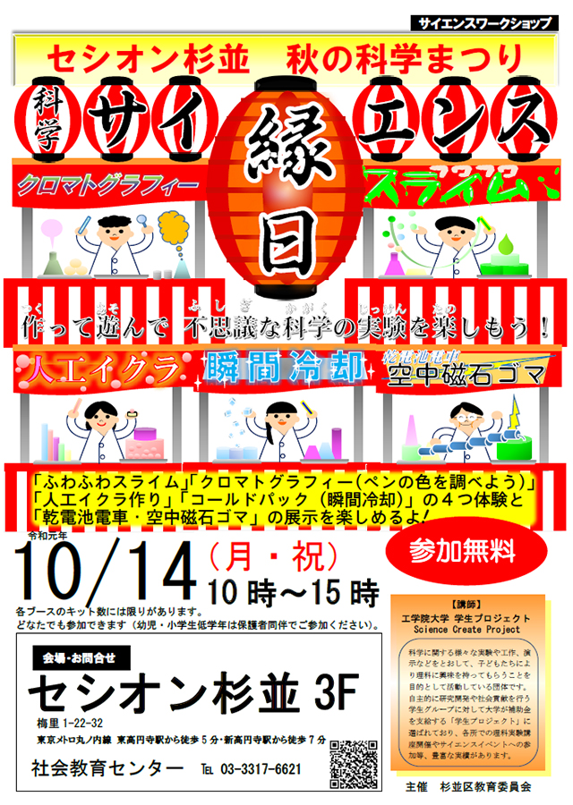 10/14(月)、SCPがセシオン杉並で「秋の科学まつり」を開催