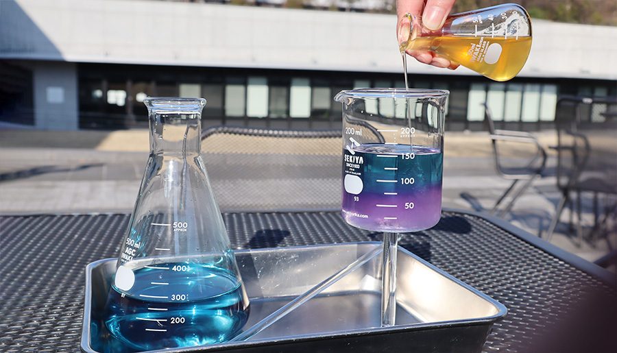 今回は、八王子市内の中学校の生徒に向けて理科授業を行いました。演目は、墨流し、ダイラタンシー、万華鏡、紫キャベツ指示薬の4つです。ふれあい講座は今回が初めての取り組みでした。