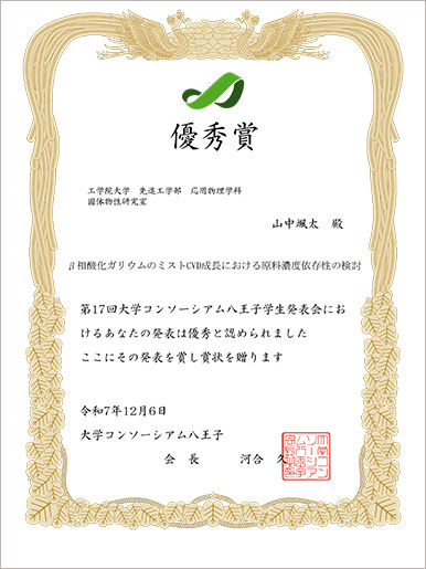 2025年12月6日に八王子学園都市センターで開催された「第17回大学コンソーシアム八王子学生発表会」において、先進工学部応用物理学科4年の照喜名朝人さん(結晶成長研究室・山口智広教授)が最優秀賞を受賞しました。