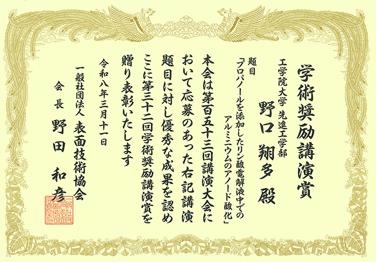 応用化学科 大原翔さんが表面技術協会 ARSコンファレンスで優秀発表賞を受賞