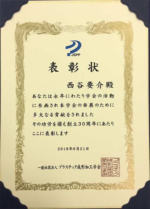 西谷要介教授(機械工学科)がプラスチック成形加工学会から功労者表彰を授与されました
