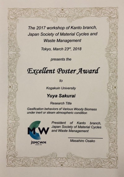 この度の研究発表でポスター賞を受賞する事ができ、大変光栄です。本研究を遂行する上で、多くの助言や知識をご教授頂いた小林潤先生をはじめとするリサイクル工学研究室のメンバーに、この場を借りて感謝申し上げます。この賞を励みに、より一層今後の研究活動に邁進します。