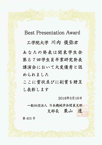 機械工学科生が機械学会関東支部においてBest Presentation Award(学生優秀賞)を受賞