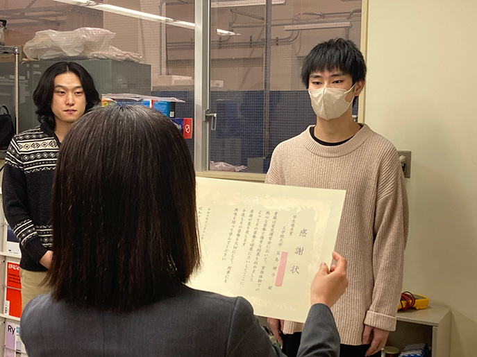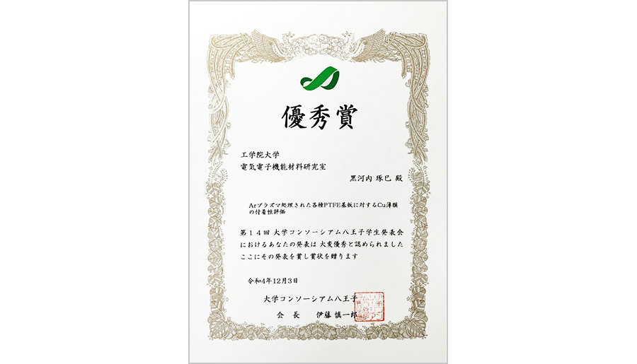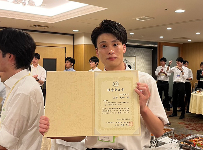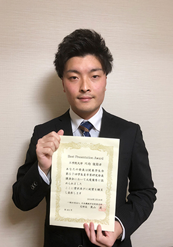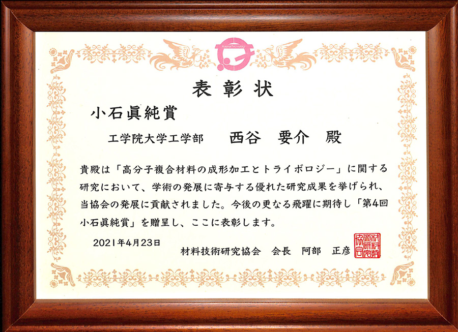 このような場でポスター発表の賞を頂き、自分の研究成果が認められ、非常に嬉しく思います。日々のご指導とこのような機会を与えてくださった機械工学科高分子材料研究室の西谷要介准教授には深く御礼申し上げます。また、支えてくれた研究室の皆様に感謝申し上げます。