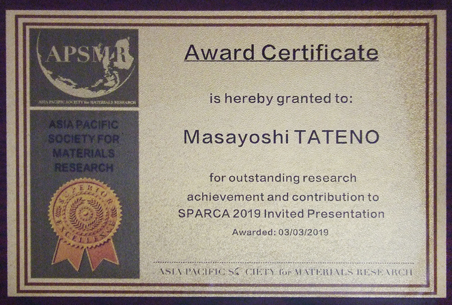 立野昌義教授(機械工学科)がAsia Pacific Society for Materials Scienceから表彰