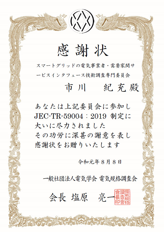 市川紀充准教授が電気学会電気規格調査会から感謝状を授与