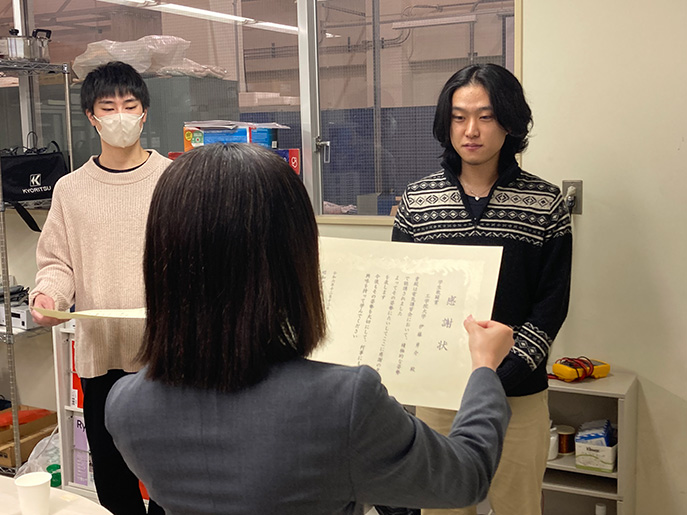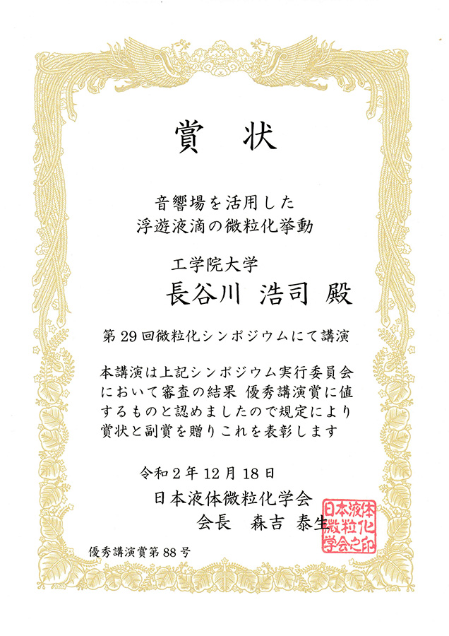 これまでの研究成果が認められ大変うれしく思います。本研究を終始御指導して頂き、このような発表の機会を与えてくださった西谷要介教授をはじめ、日々の実験や発表の準備など様々な点で協力していただいた研究室の皆様に厚く御礼申し上げます。