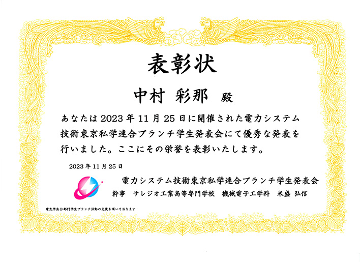 電気電子工学科 中村彩那さんが電力システム技術東京私学連合ブランチ学生発表会で優秀発表賞を受賞