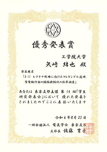 電気電子工学科 矢崎結也さんが電気学会東京支部で優秀発表賞を受賞
