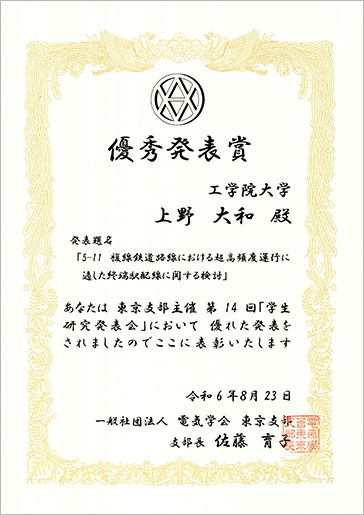 電気電子工学科 上野大和さんが電気学会東京支部で優秀発表賞を受賞