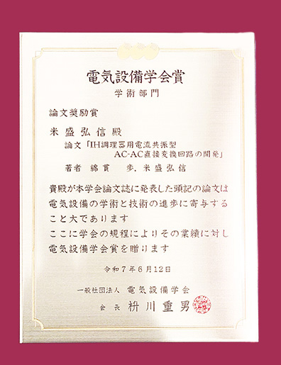 米盛弘信准教授(電気電子工学科)が電気設備学会賞 学術部門 論文奨励賞を受賞