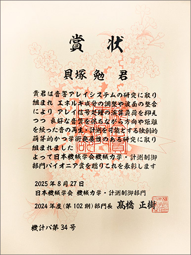 貝塚勉准教授(機械理工学科)日本機械学会 機械力学・計測制御部門 パイオニア賞を受賞