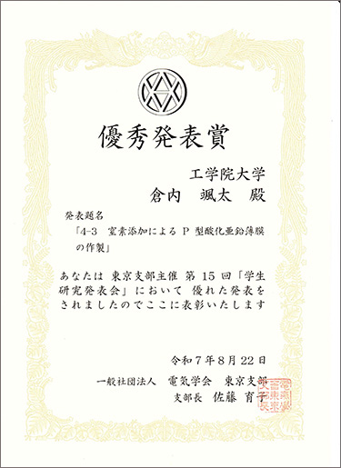 電気システム工学科生が一般社団法人日電気学会東京支部主催第10回「学生研究発表会」で優秀発表賞を受賞