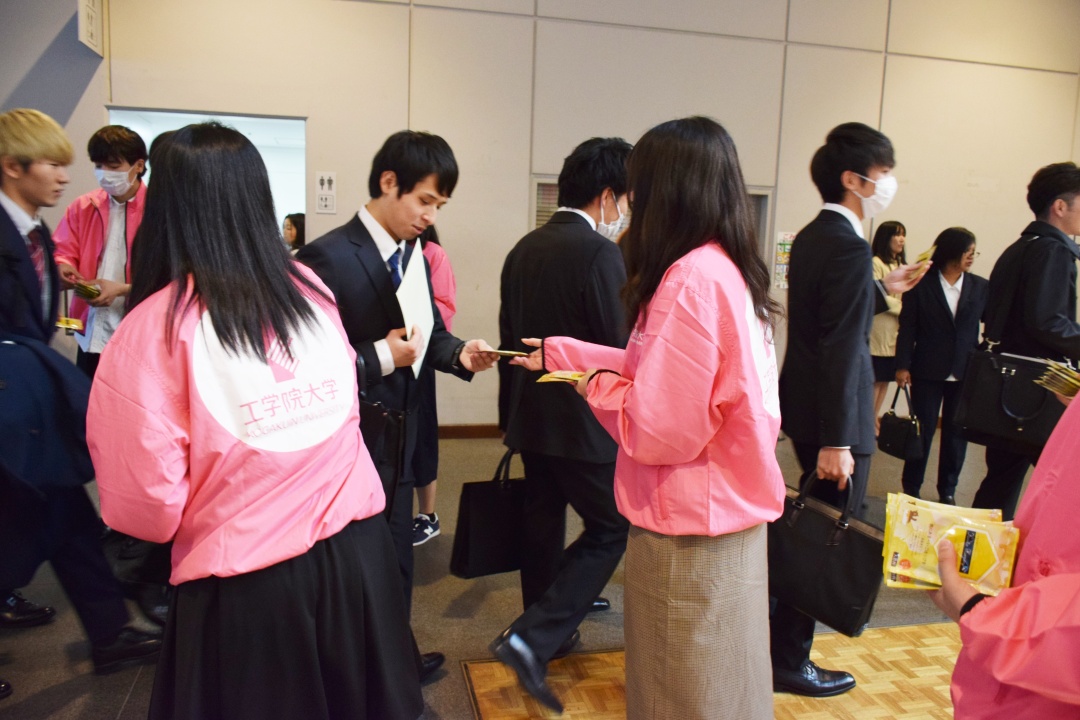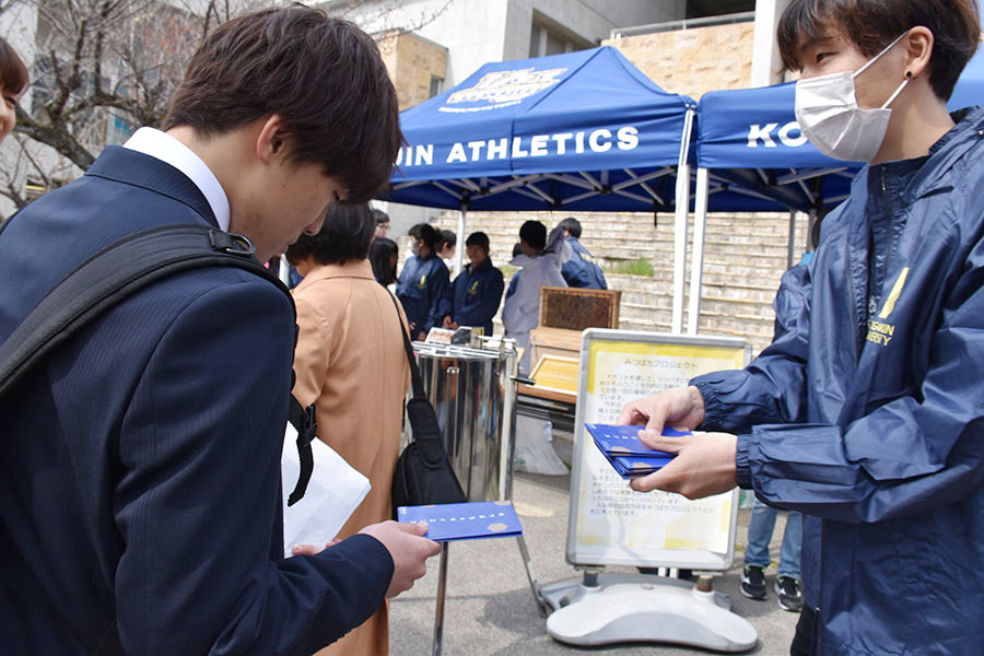 4/1(月)入学式で、「みつばちプロジェクト」「Science Create Project」の学生約30名が、オリジナル入浴料「KUTE Honey In The Bath」を新入生のみなさんにプレゼントしました。