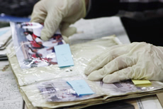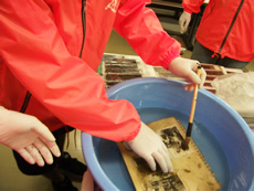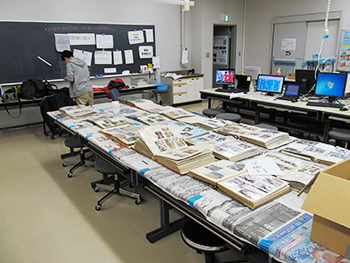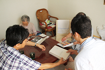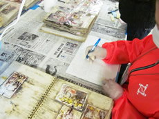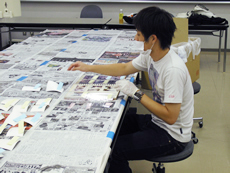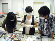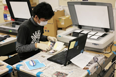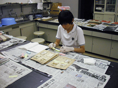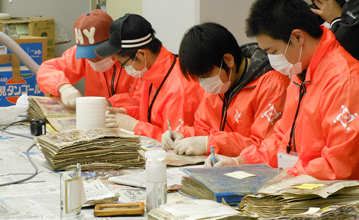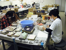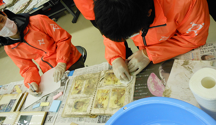 3.ボランティアの学生達がアルバムを1ページずつ、ていねいに砂ボコリや汚れを落としていく