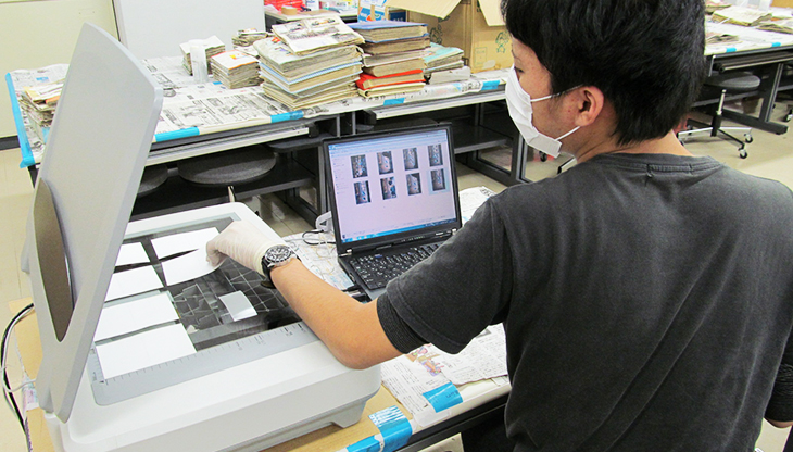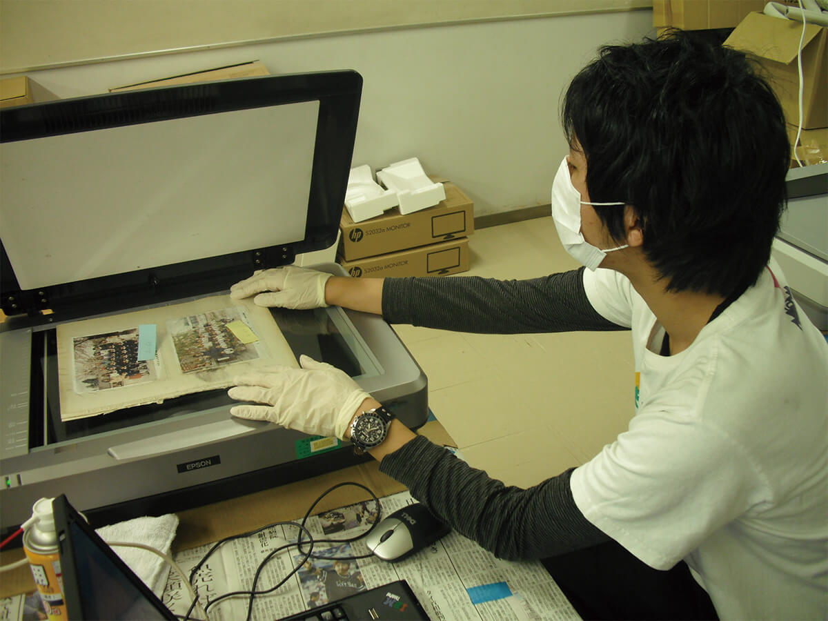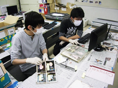 修復作業は、被災地から送られてきたアルバム写真を1枚ずつ確認し、丁寧にはがすことから始まります。まず、修復可能なものとそうでないものに分け、その後スキャニング作業を行い、しみや汚れ、破れを画像処理ソフトを用いて補修。そして新しい写真として蘇生させていく作業の繰り返しです。