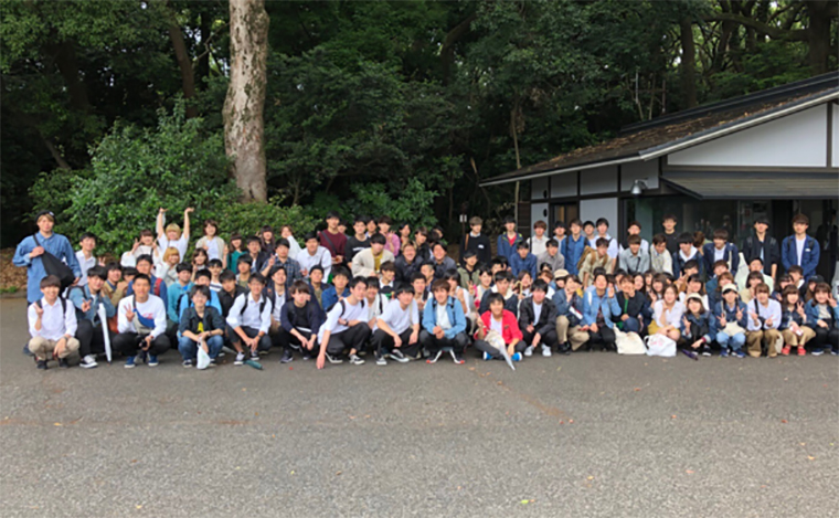 これから本格的に建築を学び始める新入生に『建築』を身近に感じてもらう、表参道の街の雰囲気を肌で感じ“まちづくり”について考察する、上級生との交流などを目的に開催されたイベントには、130人を超える学生が集まり、下級生と上級生が意見交換しながら多数の著名建築を見てまわりました。