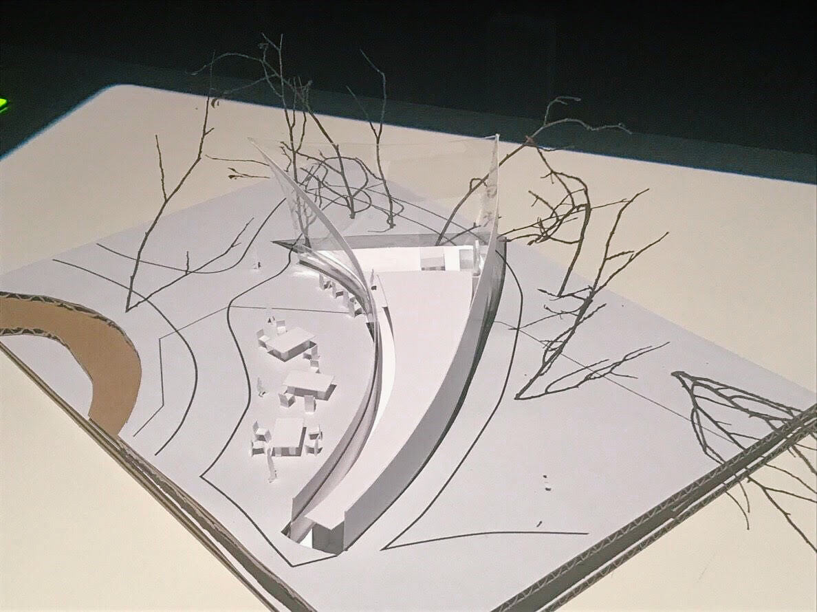 - 建設場所(左)と、50分の1模型(中央)、20分の1模型