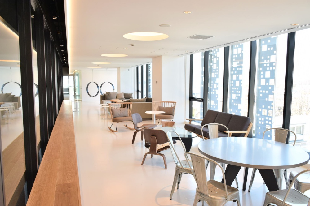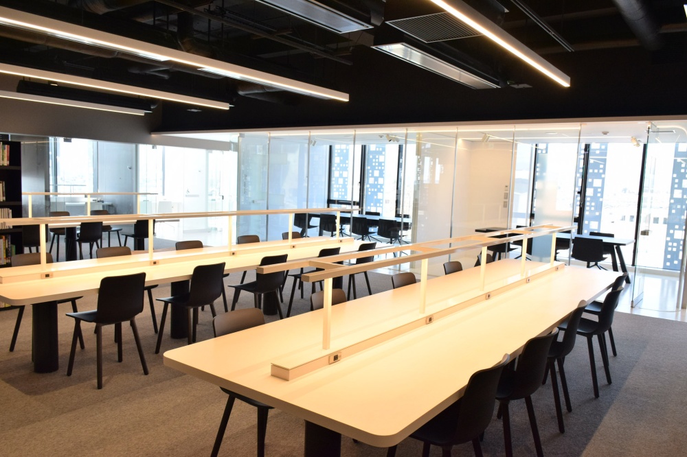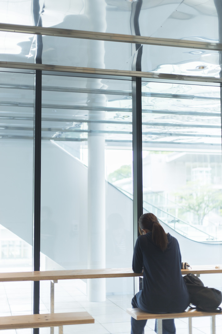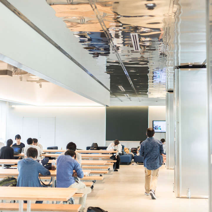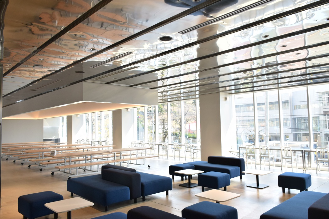 配置された家具はすべて可動式で学生が自由にレイアウトすることで、個人、グループ、講義形式などアクティブな学びを実現します。また、中庭の緑をゆらぐように映すステンレス製の天井など見どころも満載です。