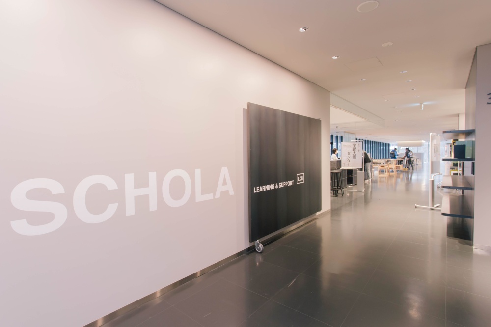 大学のメインゲートに面したラウンジではコミュニケーションボードで学内の様々な情報を得られます。
