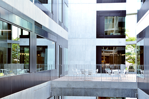 367席収容の大教室をはじめとする53数の教室・研究室のほか、学習支援センターや情報カフェテリア、大学事務機能などの学生サービス機能を集約し、より充実したカリキュラムの提供が可能に。また、ラウンジや広場などのオープンスペースをつくり、学生が交流できるスペースも確保しました。スチューデント・センターとブリッジでつなぎ、併せて八王子キャンパスの核となるセンターゾーンを形成します。さらに、この建物は省エネルギー設備の採用など環境への配慮がされ、耐震性にも優れた構造になっています。