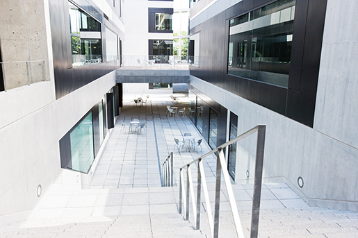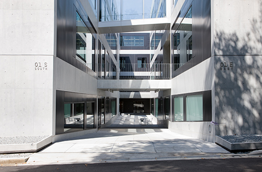外観:キャンパスモールに面した開放的で広々とした広場のあるE棟。