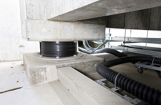 免震構造:ゴムと鉄板をミルフィーユ状に何層も重ね合わせた免震装置を68台設置。この上に建物を乗せることで、地震が起きても振動を吸収してくれる仕組みになっている。