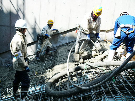 インターンシップ中の学生(左)。バイブレータをかけながらコンクリートを打設している様子です。