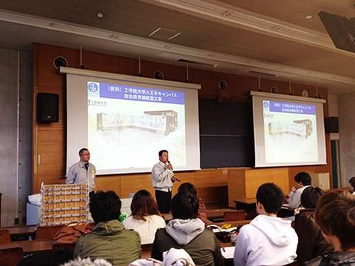 第一回現場塾「工事現場の見かた プロジェクトマネジャーは何を考えているか」で質問に答える作業所長の種元所長(右)と本学OB原副所長(左)