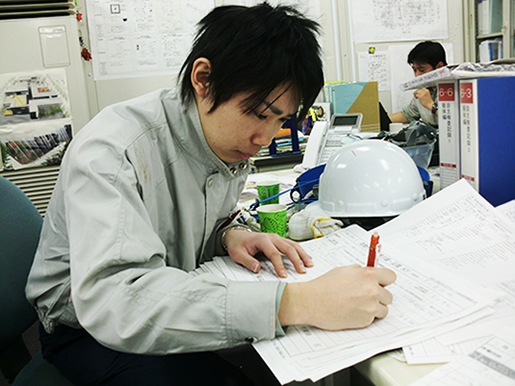 インターンシップ中の学生。KY(危険予知)用紙に、安全確認の要項を書き写す作業を行っています。