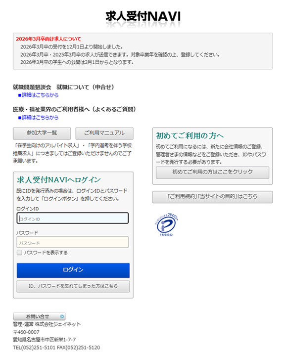 本学では、2026年3月卒業・修了生対象の求人票を【求人受付NAVI】で受け付けいたします。学生が、インターネットを通して貴社の求人情報を検索し、有効に活用できるシステムになっており、公開は学内関係者に限られております。