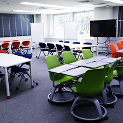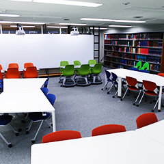 このスペースでは、学生の皆さんが授業時間外にグループで学習できる移動可能なテーブルや椅子を設置。