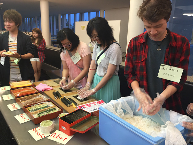 2015年6月21日から28日にかけて、本学協定校North Seattle College(アメリカ・ワシントン州)の日本語クラスの学生8名が、一週間八王子キャンパスに滞在しました。滞在中は日本語授業の他に、巻き寿司を手作りしたウェルカムパーティー、日米のゲームを紹介したゲームナイト、川越日帰りバスツアー、本学学生(キャンパスメイト)とのセミナーハウスでの宿泊などを通じて、お互いの文化・言語・遊びなどを教えあいました。