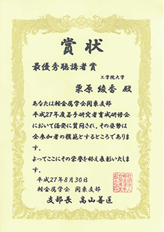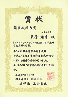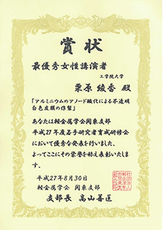 2015年8月30~31日、(株)神戸製鋼所 鬼怒川保養所で行われた一般社団法人軽金属学会関東支部主催の2015年度若手研究者育成研修会において、研究題目「アルミニウムのアノード酸化による不透明白色皮膜の作製」を口頭発表した大学院化学応用学専攻修士2年(無機表面化学研究室)栗原綾香さんが関東支部長賞、最優秀女性講演者賞、最優秀聴講者賞を受賞しました。本研修会は、軽金属に関する研究を行っている35歳未満の若手研究者を対象として開催され、30件の講演発表が行われました。プレゼンテーション能力、研究理解度、発表・聴講態度が高く評価され、今回の3賞を受賞しました。