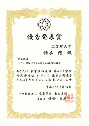 Home 2015年度のお知らせ 電気システム工学科生が、電気学会東京支部 学生研究発表会において学生研究発表会優秀発表賞を受賞 電気システム工学科生が、電気学会東京支部 学生研究発表会において学生研究発表会優秀発表賞を受賞 2015/09/17 シェアする 2015年8月31日、電気システム工学科4年(電気応用システム研究室)鈴木 陸さんが「NTAガラスの電気的特性評価」による研究発表で、学生研究発表会優秀発表賞を受賞しました。 受賞コメント 企業と共同で行っている研究ですが、社会人としての考え方など多くのことを学びながら研究ができたことに感謝しています。卒業までに、さらに完成したものにしたいと思います。 電気電子工学科 工学部 工学部の活動・実績 前へ 一覧に戻る 次へ
