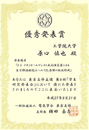 Home 2015年度のお知らせ 電気システム工学科生が、電気学会東京支部 学生研究発表会において学生研究発表会優秀発表賞を受賞 電気システム工学科生が、電気学会東京支部 学生研究発表会において学生研究発表会優秀発表賞を受賞 2015/09/17 シェアする 2015年8月31日、電気システム工学科4年(電気応用システム研究室)原口 慎也さんが「イオンビームアシスト反応性蒸着法による生分解性樹脂上へのTiO2薄膜の低温形成」による研究発表で、学生研究発表会優秀発表賞を受賞しました。 受賞コメント 研究内容や実験を理解するまで時間がかかりましたが、実験結果が予想したようになり大変嬉しかったです。この経験を将来に役立てていきたいと思います。 電気電子工学科 工学部 工学部の活動・実績 前へ 一覧に戻る 次へ