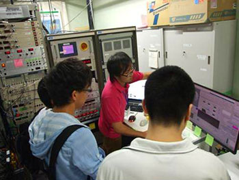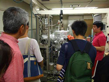 (八王子キャンパス)研究室公開「フォトニクス研究室、結晶成長研究室、固体物性研究室」 分子線エピタキシ装置を説明しています