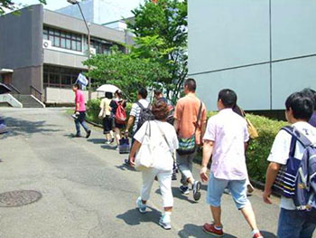 (八王子キャンパス)みんなでキャンパスツアーに出発!まずは坂を上って・・・