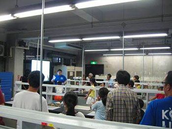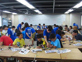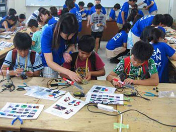 「3原色LEDで様々な光の色を作り出そう」 製作風景。みんな真剣です。