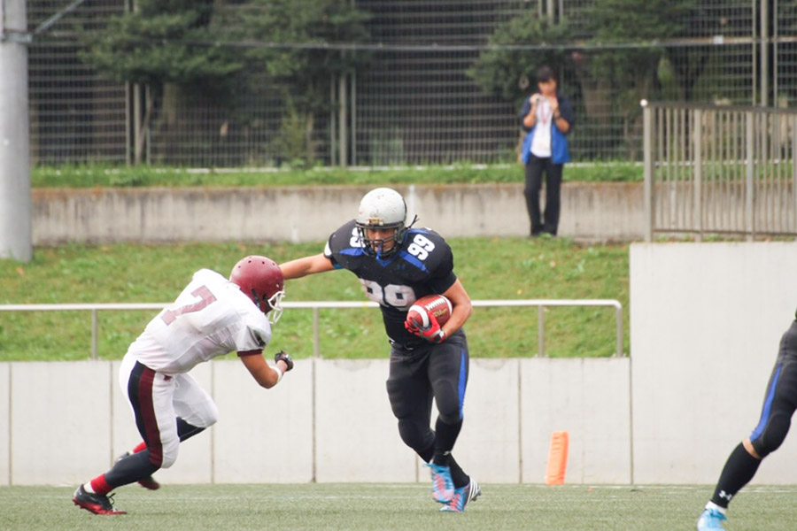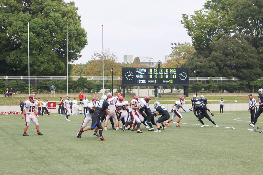 工学院大学は第1クオーターで先制し、そのまま流れに乗って各クオータで立て続けにタッチダウンを決めました。またディフェンスでは、QBサックやインターセプトなどで圧倒し明星大学をを無得点で抑えて勝利しました。
