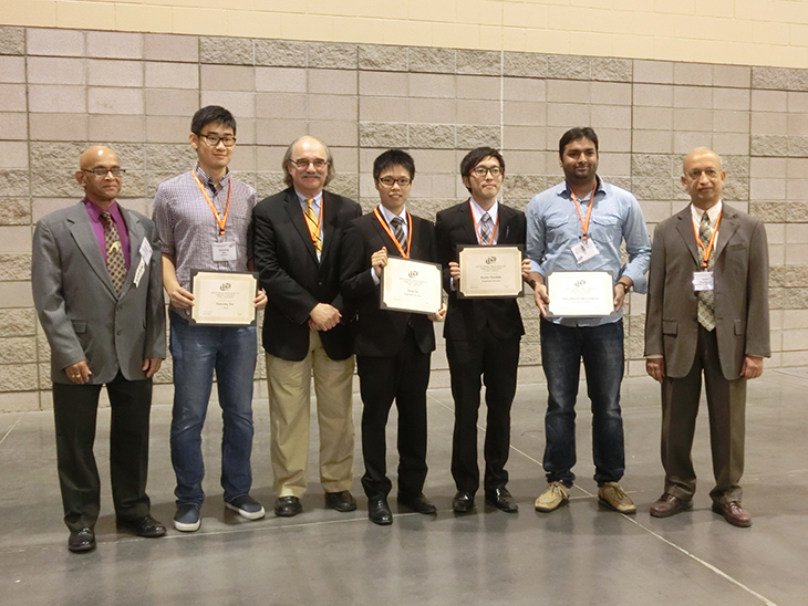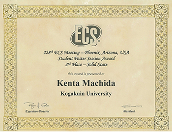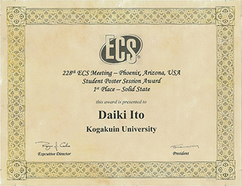 2015年10月13日、アリゾナ州フェニックス(アメリカ)で開催された228th Electrochemical Society (ECS) Meeting(第228回アメリカ電気化学会大会)の学生ポスターセッションにおいて、化学応用学専攻修士2年(無機表面化学研究室)伊藤大喜さん、町田健太さんが学生ポスター賞Solid-State部門の第一位、第二位を獲得しました。