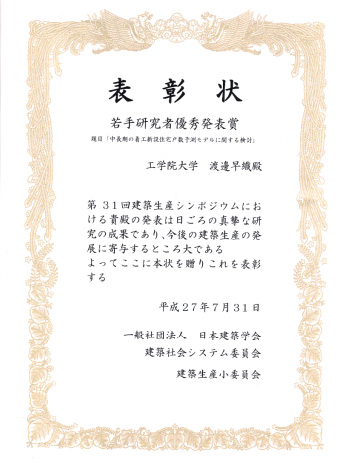 2015年7月31日に開催された日本建築学会 第31回建築生産シンポジウムにおいて、建築学専攻修士課程1年(建築生産研究室)渡邊 早織さんが「中長期の着工新設住宅戸数予測モデルに関する検討」による研究発表で、若手研究者優秀発表賞を受賞しました。