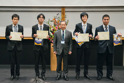 表彰式でBest Poster Awardを受賞者と学長の記念写真 右から高橋優輔さん、半坂剛志さん、佐藤学長、佐藤利春さん、大久保亨さん