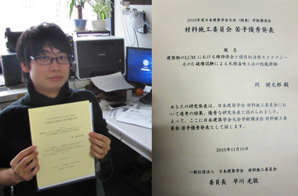 2015年9月4日に開催された日本建築学会・材料施工委員会において、建築学専攻修士課程1年(田村研究室)岡 健太郎さんが「建築物のLCM における維持保全と保存的活用ストラテジー その5 破壊試験による木摺漆喰工法の性能評価」による研究発表で、若手優秀発表賞を受賞しました。