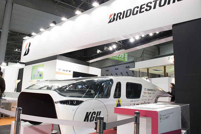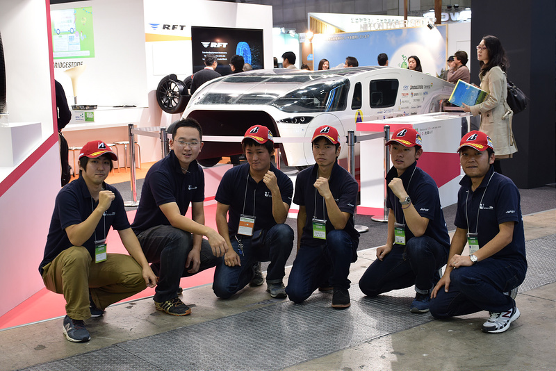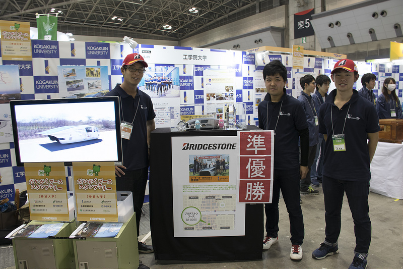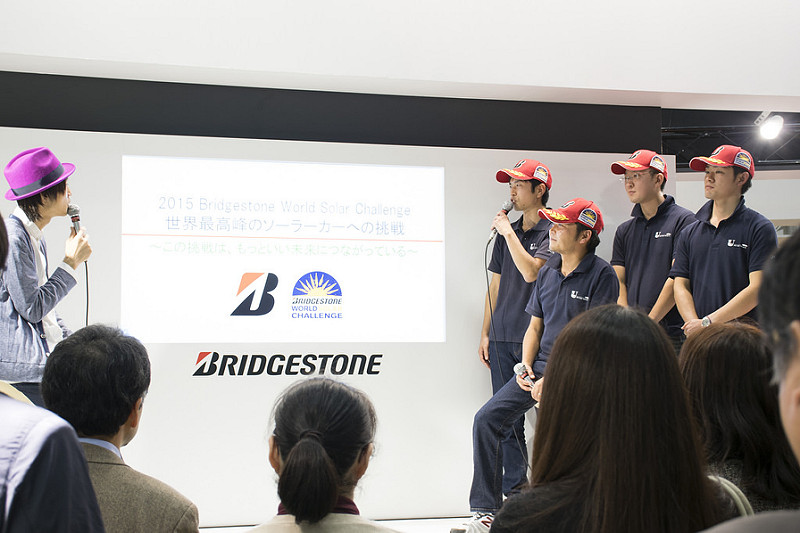 また、国際的なソーラーカーレース「ブリヂストン・ワールド・ソーラー・チャレンジ2015」クルーザークラスで準優勝を収めたソーラーカープロジェクトの3号機[OWL]が、サポート企業である「ブリヂストン」ブースに登場しました。14:30から行われたトークショーには、濱根監督とプロジェクトの学生たちが登壇。ブリヂストン・ワールド・ソーラー・チャレンジ2015のレースを振り返りました。ソーラーカープロジェクトは、12日(土)12:00よりNPO・大学ラウンジでも講演を行います。