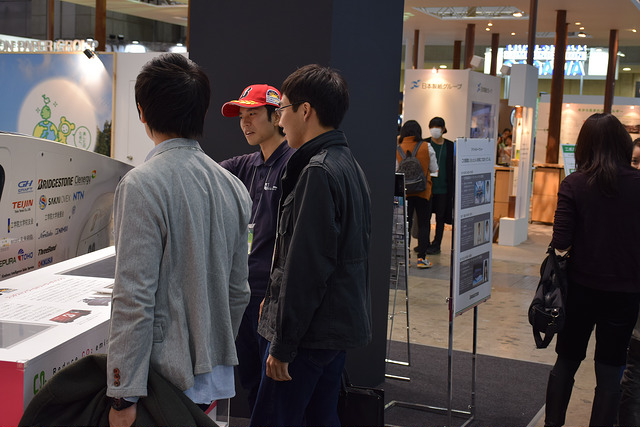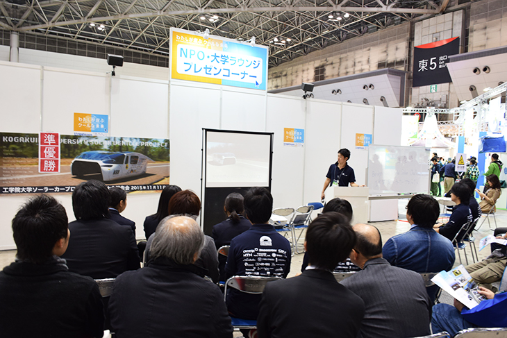 今年は、国際的なソーラーカーレース「ブリヂストン・ワールド・ソーラー・チャレンジ2015」クルーザークラスで準優勝を収めた3号機[OWL]がサポート企業の一つ、ブリヂストンのブースに初登場。開幕初日にソーラーカープロジェクトメンバーらが特設ステージでトークショーを行い、また、最終日にはNPO・大学ラウンジでも世界大会参戦の様子を講演しました。