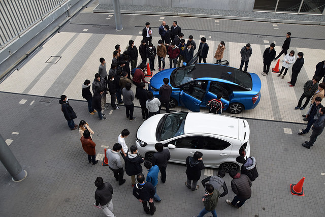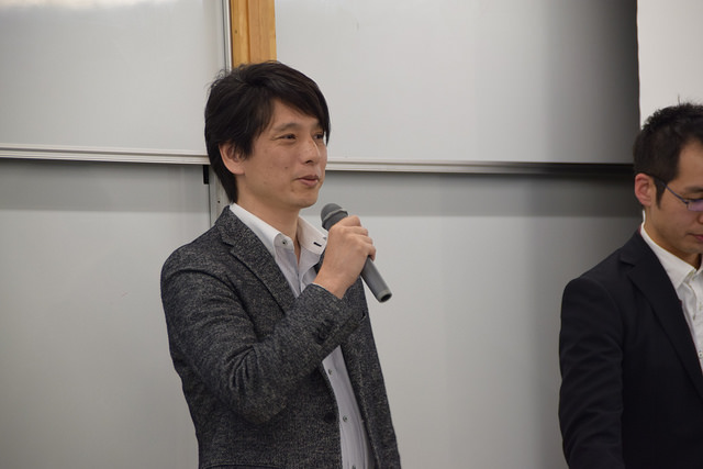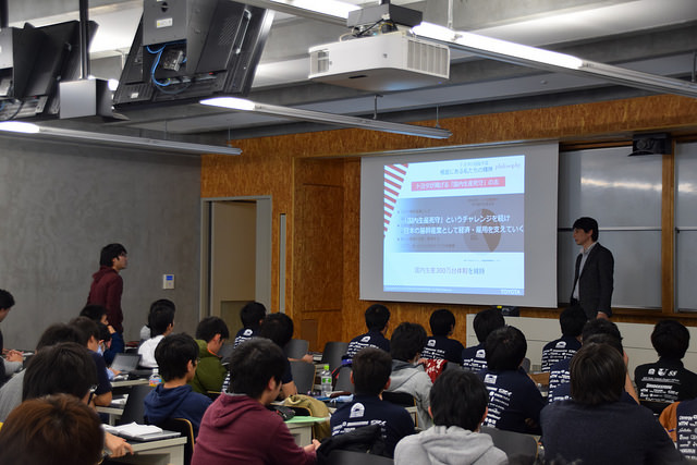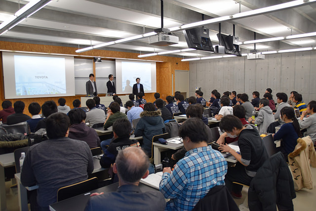 交流会に先立ち、トヨタ自動車株式会社の野田修二さん(1990年機械工学科卒業)・松永一誠さん(2007年情報工学科卒業・2009年情報学専攻修了)から、世界と日本における自動車産業の位置づけなどが説明されました。