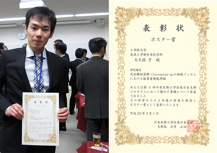 2016年3月1日、第4回日本生物工学会東日本支部コロキウムにおいて、大学院化学応用学専攻修士1年(生物資源化学研究室)大久保 亨さんが、「気生微細藻類Coccomyxa sp.の細胞フィルムにおける脂質蓄積能評価」に関する研究で、ポスター賞を受賞しました。